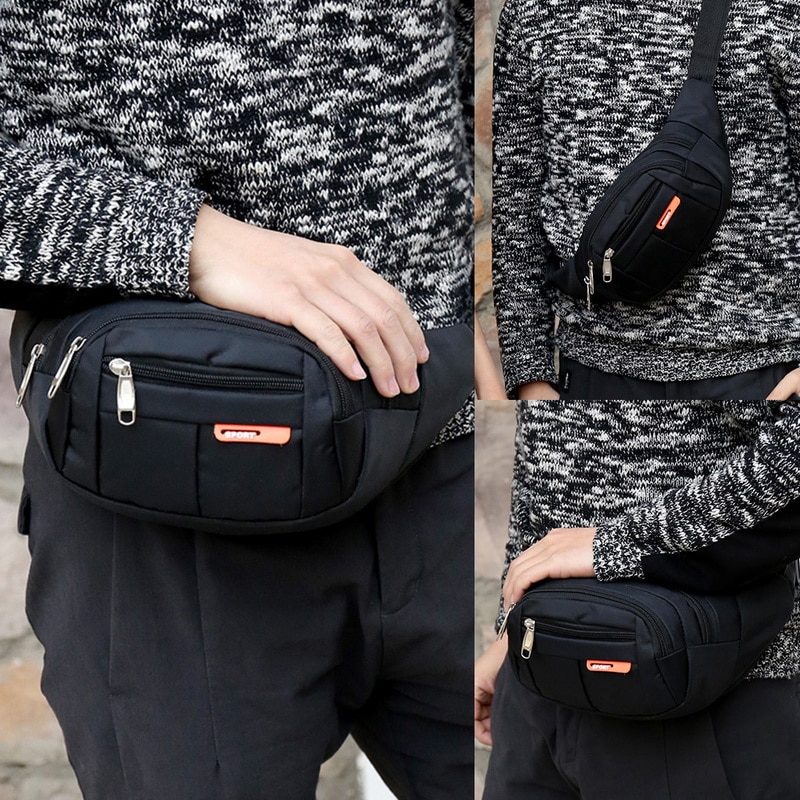 FEATURE1:Zippered front accessory pocket is great for keys,cell phone and other small items. FEATURE2:The front outside surface is made of water-resistant nylon material. FEATURE3:Features adjustable waist straps for greater comfort when moving around.